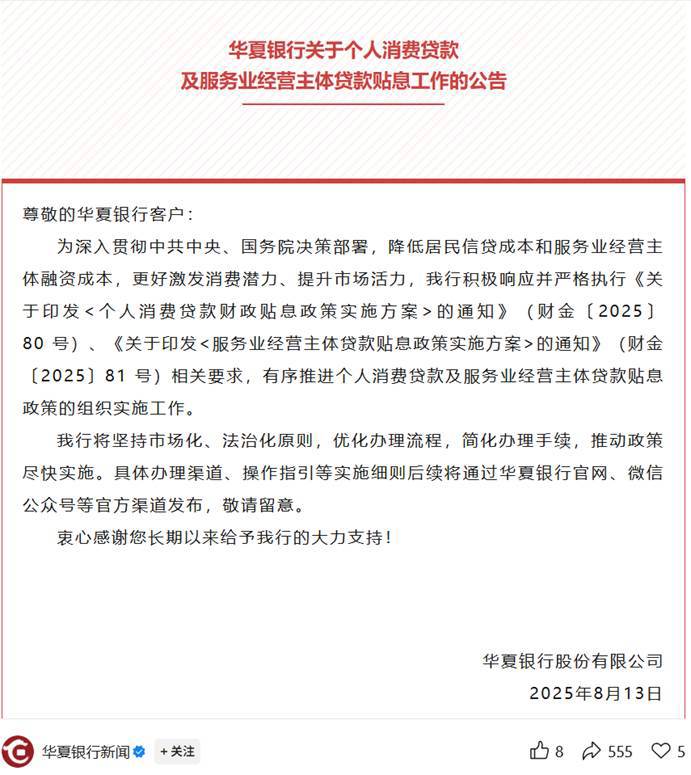 华夏银行积极落实贷款贴息政策 加速助力提振消费